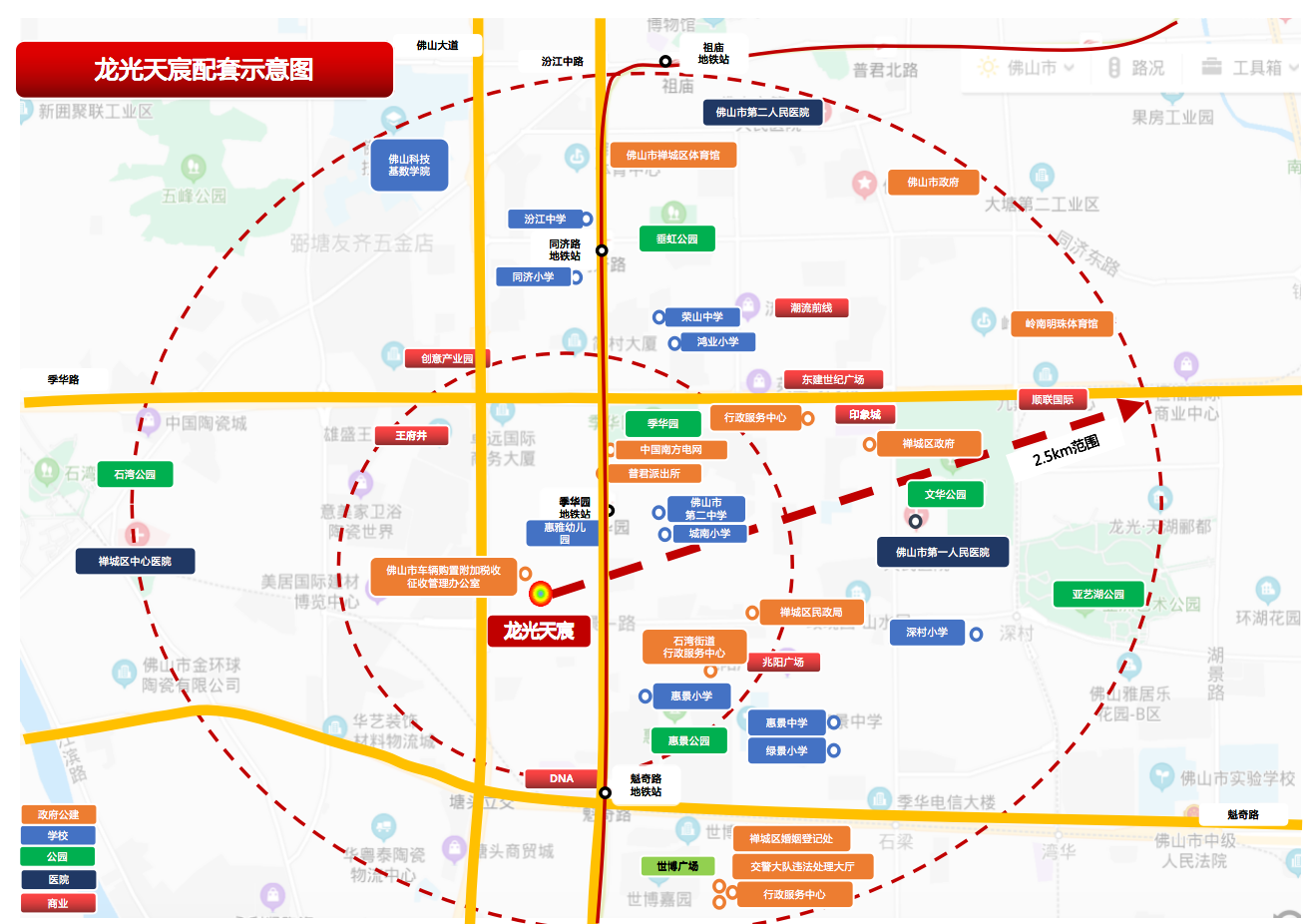 作为禅芯唯一在售的百亩大城,龙光天宸享有得天独厚的地段:位处“佛山经济命脉”季华路CBD之上,周边汇集市政府、财政大厦等30多家重要市政机构; 10大商业体环绕,王府井一路之隔;距离广佛线季华园站仅约450米,有2号线在建中,4号线规划中,建成后3地铁环绕;更有叶脉公园、亚艺公园等近100万㎡公园景观资源。